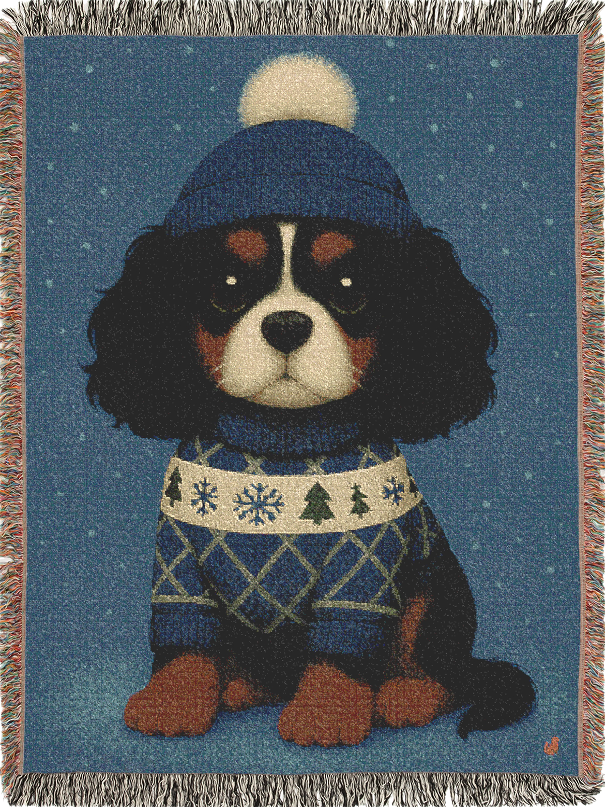 Wrap yourself in cozy charm with Cavy Comfort, a woven blanket that brings warmth, whimsy, and a dash of a Tricolor Cavalier's sweetness to your home. Featuring an adorable pup bundled in a winter sweater and beanie, this blanket captures the pure comfort of companionship; perfect for snuggling up on cold nights or adding a touch of joy to your decor.